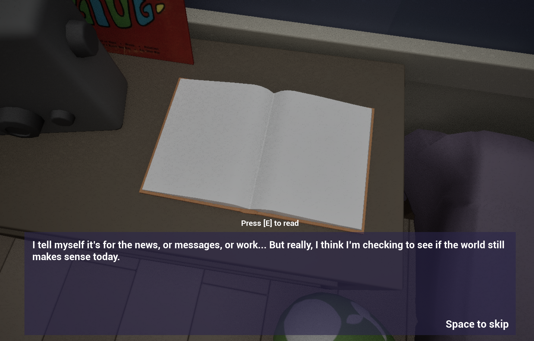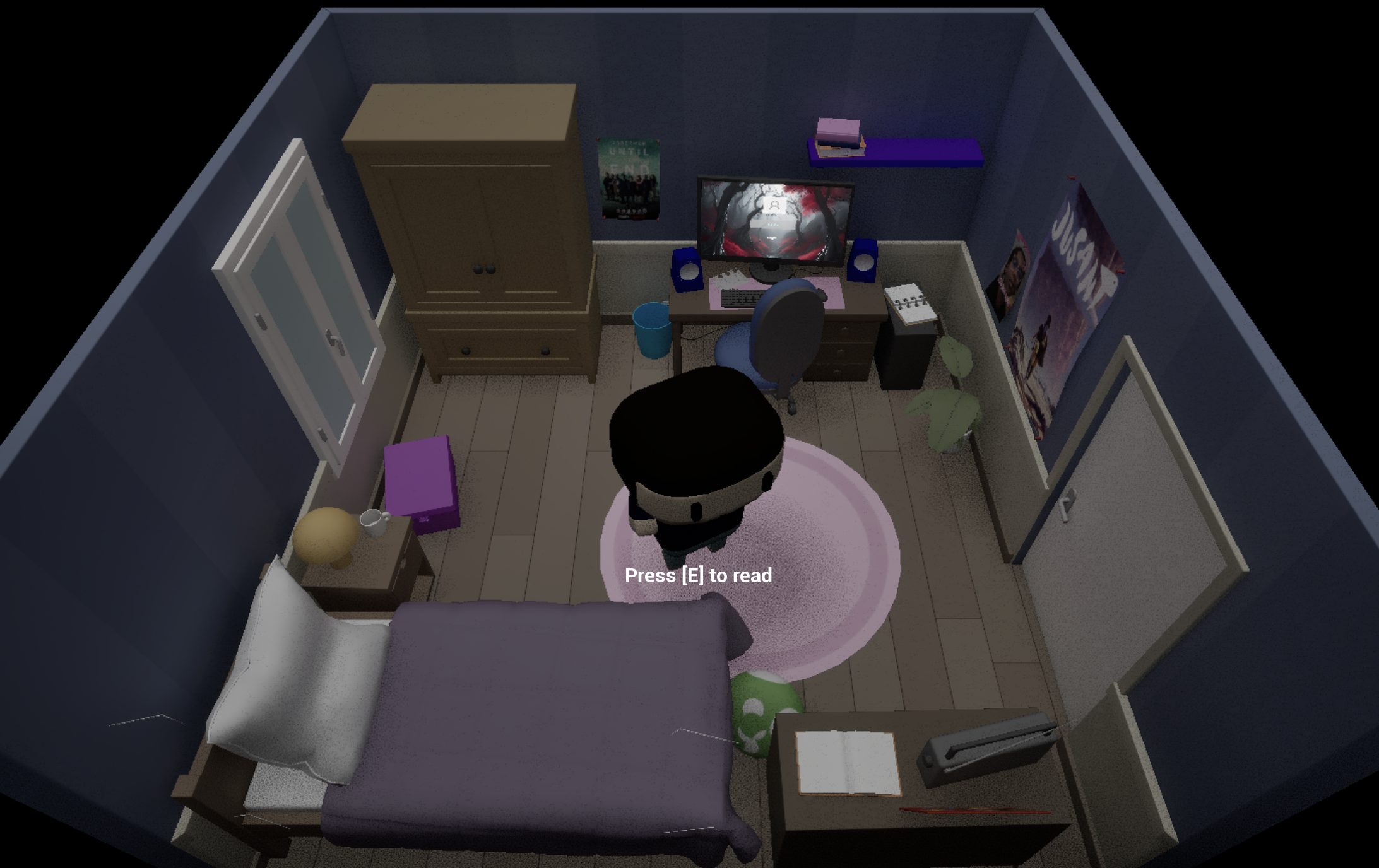 This is a short 3D top-down puzzle-narrative experience about someone who doesn’t quite feel at home in their own identity. Through simple interactions, environmental puzzles, and a private journal, you explore familiar spaces while navigating doubt, routine, and small moments of self-reflection.